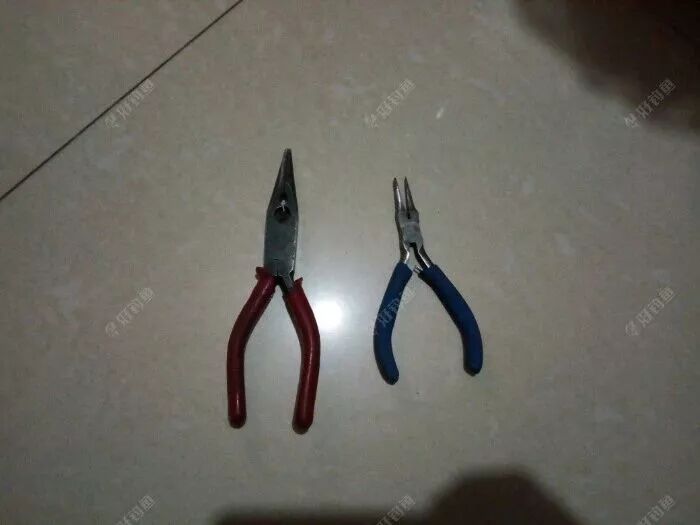 看握制的小环还可以吧。等对好用尖嘴钳剪断,一定要两条腿一样长。桶两边需要两个,所以做两个。