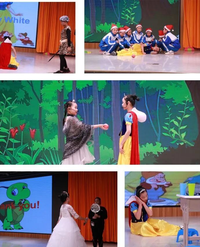 本次比赛,从英语口语,演员服装,角色表演,情景和背景设计各方面都是高水准,给大家带来一场精彩绝伦的视听盛宴。节目风格多样,有充满童趣的《三只小猪》,《小蝌蚪找妈妈》,有富有教育意义的《狼来了》,《小猫钓鱼》。有诙谐幽默的《皇帝的新衣》,有经典 的《白雪公主》,《卖火柴的小女孩》和《小红帽》……。演员们扮演的角色跨度大,有各种动物:狼,猪,猫,鸭子,青蛙,小白兔,蝴蝶,蜜蜂……。有各种人物:外婆,皇帝,皇后,骗子,牧童……充分展示了我校学生的英语口语素养能力,能将课本固定不变的知识转化为灵活多变的语言形式。让我们一睹风采吧。