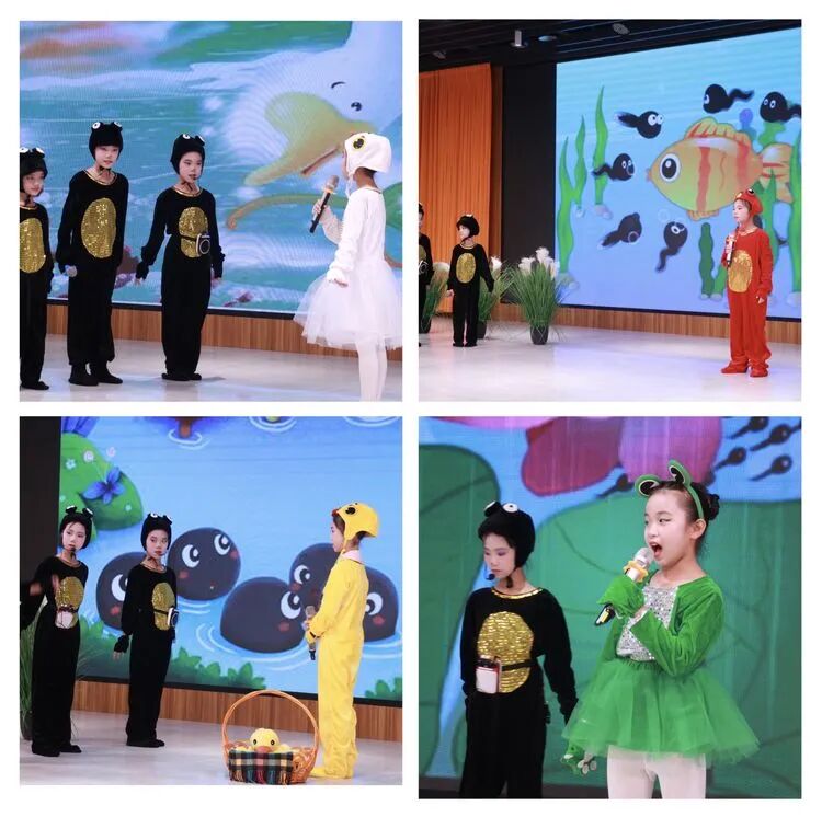 Baby tadpoles, mummy duck, mummy fish, mummy turtle, mummy goose, mummy tadpole .You are so great !作为三年级的学生,孩子们的流利的英语对白,逼真的表演动作,完整的故事表达,配合完美的音乐,呈现了一幕高水准的情景剧。