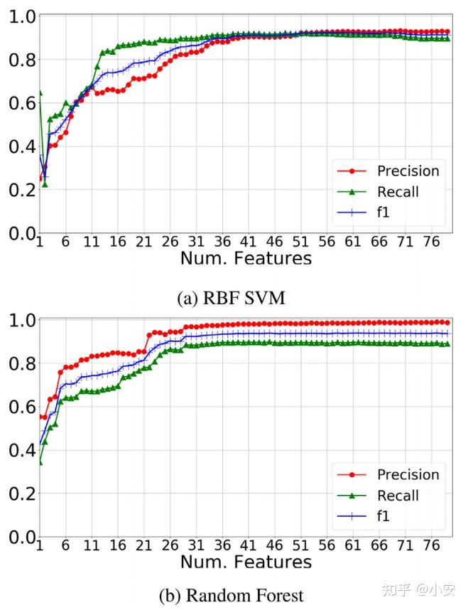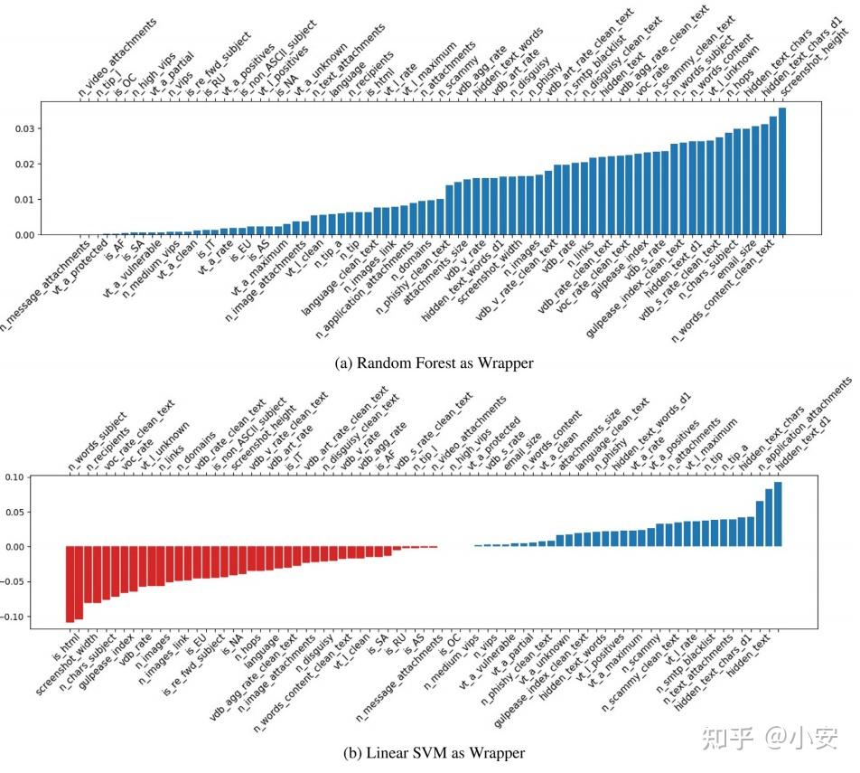 Wrapper 方法已被用于选择特征的最佳子集:它包括使用给定 ML 模型(称为 Wrapper)的预测性能来评估特征子集的相对有用性。在随机森林的情况下,特征的重要性表示该特征对减少基尼不纯度的贡献有多大,这很容易计算。至于 RBF SVM,相反,计算特征的实际重要性是一个复杂的过程,出于这个原因,具有线性内核的 SVM 已被用于计算特征重要性。这些研究的结果如下图所示。由于互信息分析,它们证实了已经发现的内容,还有一些有趣的补充:接收者的数量和主题的单词也与分类相关。此外,如果与其他特征相关,来自威胁情报过程的信息也会变得很重要。