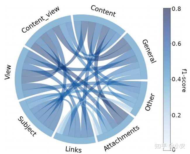 • 因此不考虑Content,四个特征字段就足以获得良好的性能,避免提取所有特征的成本。然而,即使只有两个特征字段也可以满足要求,因此已经对哪个是最好的字段进行了详尽的研究。下图显示了所有可能对的 F1-score 性能:将Content特征与View、General和Attchment中的任何一个结合起来,可以获得具有两个特征字段的最佳性能。对于Attchment尤其如此,这是一个意想不到的结果,因为仅此字段的性能就很差。