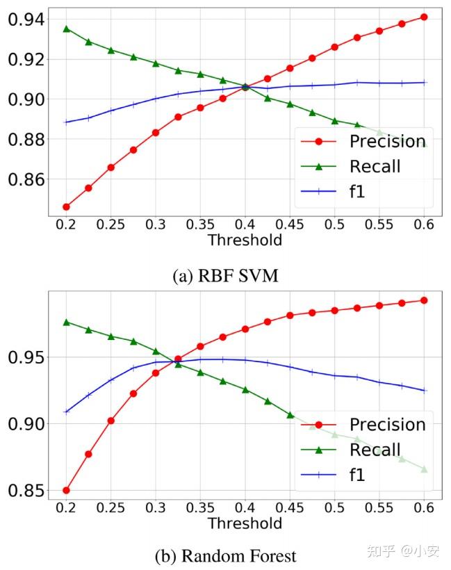 分类阈值已使用上面报告的类权重进行了调整。下图显示了作为分类阈值函数的 RBF SVM 和随机森林的精度、召回率和 F-measure。根据上图,即使在召回率更重要的情况下,随机森林也显示出比 RBF SVM 更好的性能。分析 F-Measure 曲线峰值处的图形,随机森林召回率 (93%) 获得比 RBF SVM 召回率 (88.8%) 更高的值,但保持更高的 精度值(96.5% vs. 93%)。此外,即使是可实现的最佳 RBF SVM 召回率(93.5%)也几乎无法击败之前的随机森林召回率。因此对于本研究,随机森林是最好的监督机器学习模型。 RBF SVM 的最佳分类阈值为 0.525,随机森林的最佳分类阈值为 0.375。