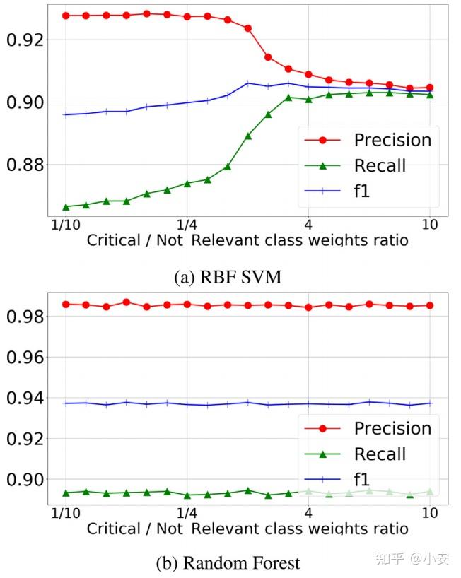 上图显示了 RBF SVM 和随机森林的精度、召回率和 F-measure,改变了分配给两个类别的权重。随机森林在一般情况下具有更好的性能(F-measure 为 93.8%)。另一方面,RBF SVM 以牺牲精度 (90.6%) 为代价获得了更高的召回率 (90.3%)。在某些情况下,RBF SVM 可能更适合最大化召回率(高达 90.3%)并最小化风险。在其他情况下,可能更普遍的是,与精度(下降到 90.6%)的权衡意味着过多的误报。随机森林的 Re call 值略小(高达 89.1%),但精度值要高得多(高达 98.5%)。因此选择的类权重是: