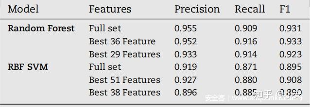 学习算法的性能评估过程需要使用一组在训练和优化阶段从未见过的样本进行最终测试。最终在测试集(之前保留的数据集的 15%)上测试了适当调整的两个模型的分类性能,获得的结果如下表所示。与相比,性能仅低 1-2 个百分点验证阶段。这些最终结果证实了随机森林是实现研究目的的最佳选择,最高 95.2% 的精度、91.6% 的召回率和 93.3% 的 F-Score 达到 36 个特征。