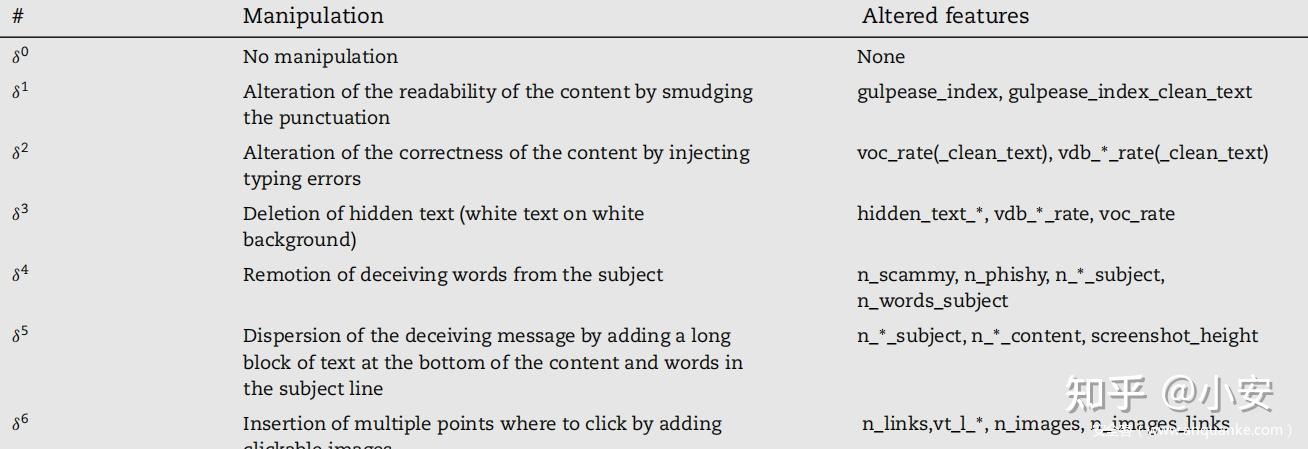 理由:电子邮件携带的实际消息是内容,这也是分析的主要元素之一,以检测攻击的存在并估计其有效性。这是攻击者用来满足研究者认为攻击成功所必需的第一个条件的主要手段:必须说服接收者。这些特征可能允许分类器将收件人立即丢弃的电子邮件与那些诱发错误的电子邮件区分开来,从而对攻击者有利。例如,搜索伪装词很有用,因为与公司通常使用的地址或域类似的地址或域经常被精心设计以欺骗员工。