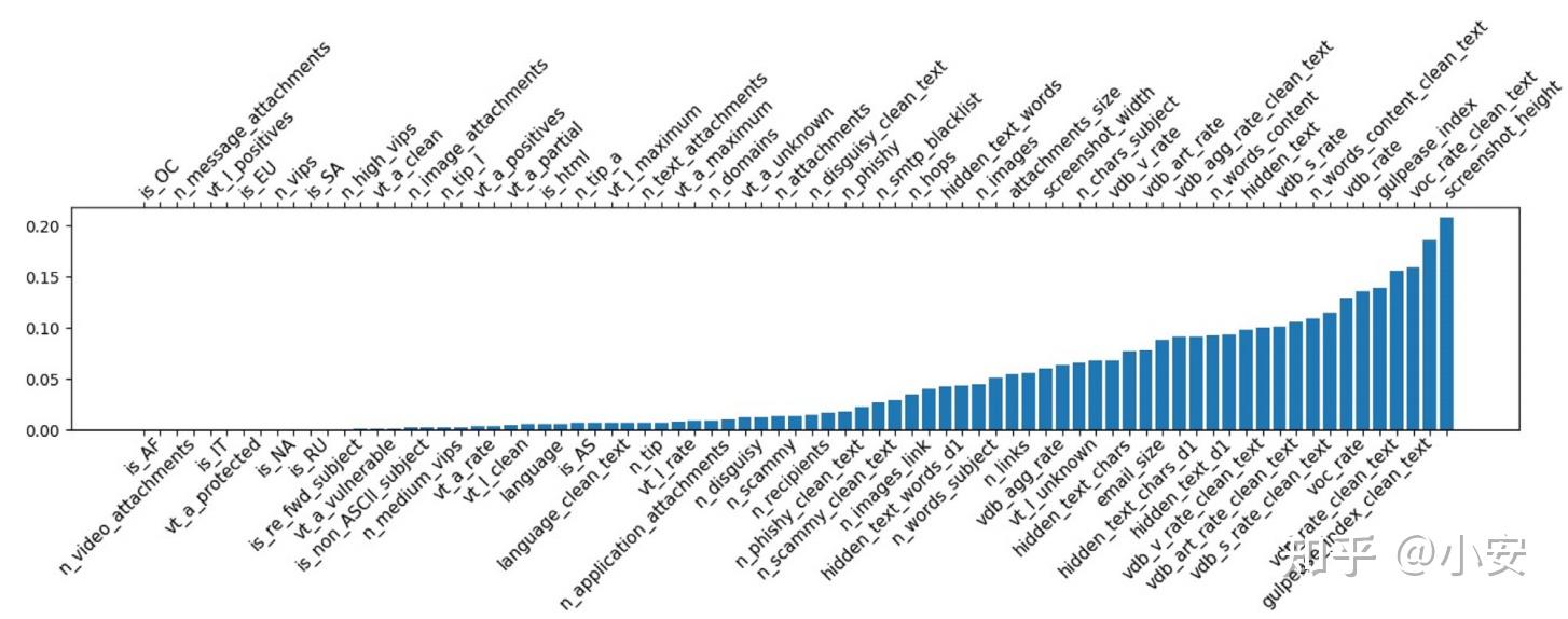 为了估计每个特征 fi 的个体预测能力,已经计算了它与离散(二进制)目标变量 y 之间的互信息。结果如上图所示,表明成功的电子邮件攻击的区别特征主要涉及内容的编写方式。评价标点符号的文本可读性的指标、信息在高度上的分散程度、句法的正确性和简洁程度以及所使用的术语都是非常相关的特征。上图还显示,“clean text”版本中的“Content”特征几乎都比“normal”版本重要。这证实了需要一种方法来识别和隔离注入电子邮件中的隐藏文本。有趣的是,垃圾邮件的来源国并不是识别关键垃圾邮件的判别因素,而与信誉系统相关的特征(如 VirusTotal 和 SMTP 黑名单)以及 SMTP 跃点数提供了相当重要的贡献。