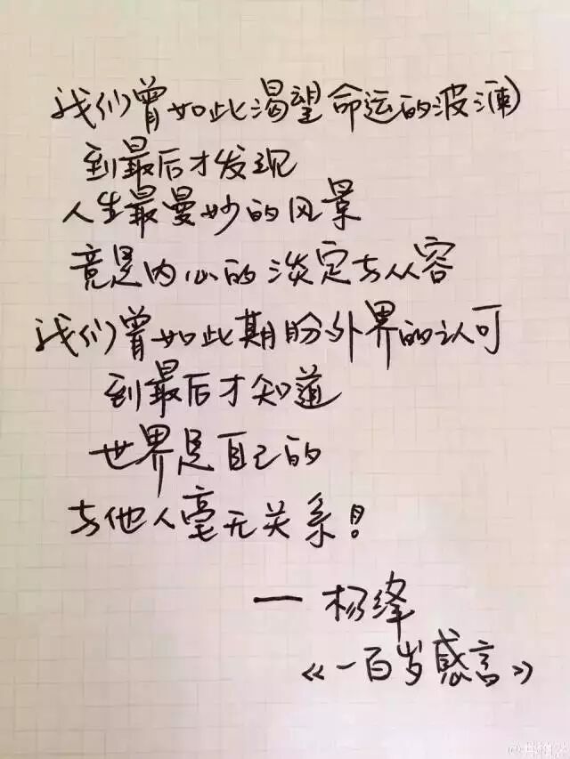 从1994年开始,钱钟书住进医院,缠绵病榻,全靠杨绛一人悉心照料。不久,女儿钱瑗也病中住院,与钱钟书相隔大半个北京城,当时八十多岁的杨绛来回奔波,辛苦异常。钱钟书已病到不能进食,只能靠鼻饲,医院提供的匀浆不适宜吃,杨绛就亲自来做,做各种鸡鱼蔬菜泥,炖各种汤,鸡胸肉要剔得一根筋没有,鱼肉一根小刺都不能有。“钟书病中,我只求比他多活一年。照顾人,男不如女。我尽力保养自己,争求‘夫在先,妻在后’,错了次序就糟糕了。”1997年,被杨绛称为“我平生唯一杰作”的爱女钱瑗去世。一年后,钱钟书临终,一眼未合好,杨绛附他耳边说:“你放心,有我呐!”内心之沉稳和强大,令人肃然起敬。“钟书逃走了,我也想逃走,但是逃到哪里去呢?我压根儿不能逃,得留在人世间,打扫现场,尽我应尽的责任。”当年已近九十高龄的杨绛开始翻译柏拉图的《斐多篇》。2003年,《我们仨》出版问世,这本书写尽了她对丈夫和女儿最深切绵长的怀念,感动了无数中国人。而时隔四年,96岁高龄的杨绛又意想不到地推出一本散文集《走到人生边上》,探讨人生的价值和灵魂的去向,被评论家称赞:“九十六岁的文字,竟具有初生婴儿的纯真和美丽。”走到人生的边上,她愈战愈勇,唯愿“死者如生,生者无愧”——钱钟书留下的几麻袋天书般的手稿与中外文笔记,多达7万余页,也被杨绛接手过来,陆续整理得井井有条:2003年出版了3卷《容安馆札记》,178册外文笔记,20卷的《钱钟书手稿集•中文笔记》也将于今年面世......这位百岁老人的意志和精力,让所有人惊叹!