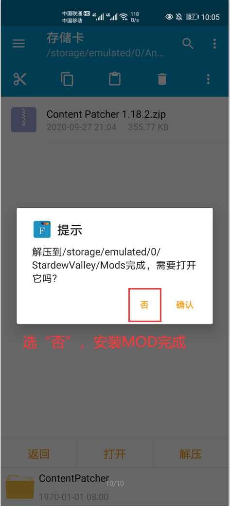 解压完成后选择“否”,至此就完成了这个MOD的安装。