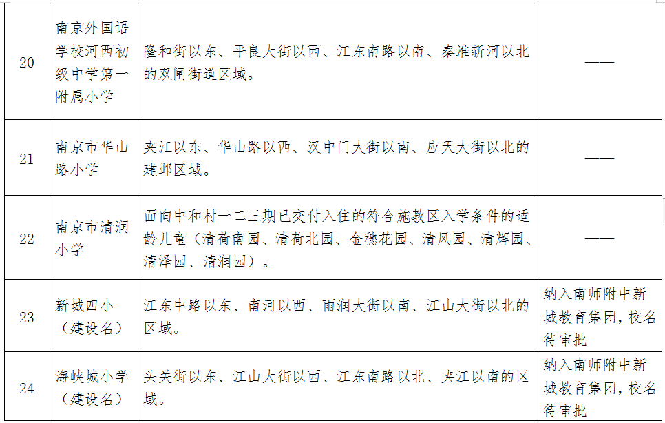 江浦街道华光社区(原华山村)、新合社区、老虎桥社区、巩固社区(巩固社区指的是以宁合高速为界,以南地区为行知小学施教区,具体指庙东村民组、东华村民组、雍庄村民组)(已划入新建学校施教区的区域除外)。