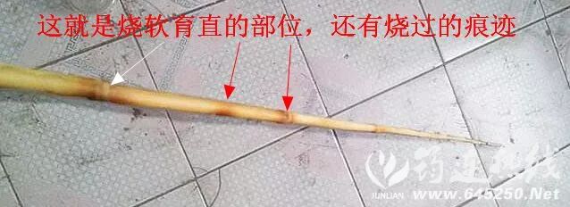 剔除了竹丫枝,接下来,是将这根毛坯鱼竿进行育直。怎样才能够把一根不很直的竹竿育直呢?那就是用干竹小块合在一起做成一把小火把(或者用煤油灯,那时候农村没有电灯,普遍使用煤油灯)。点燃小火把,将毛坯鱼竿不直的地方放在小火把上烤,因为是生竹,火把对着烤,也不会烧坏,当然要掌握好火候,烧软即可。烤软了,再用旧毛巾等布包着毛坯鱼竿,放在膝盖上,将不直的地方逼直,并马上浇上冷水。使竹竿冷却后,不回到原来弯的位置。这样,就把不直的毛坯鱼竿育直了。