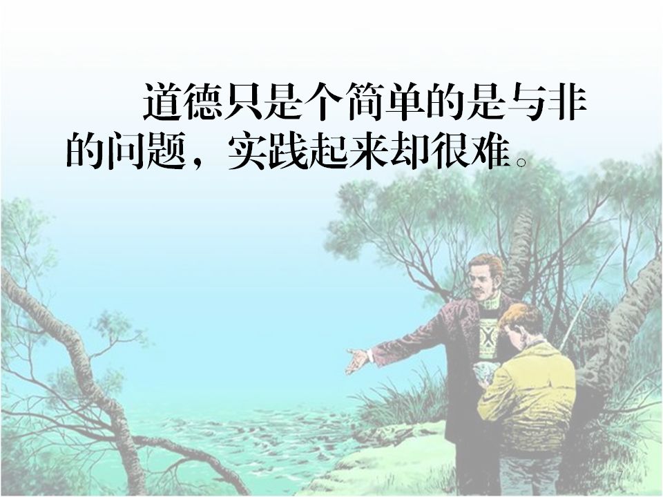 生:第10自然段,“道德只是个简单的是与非的问题,实践起来却很难。”找的准确,(PPT3 按动)(同学们齐读一下)