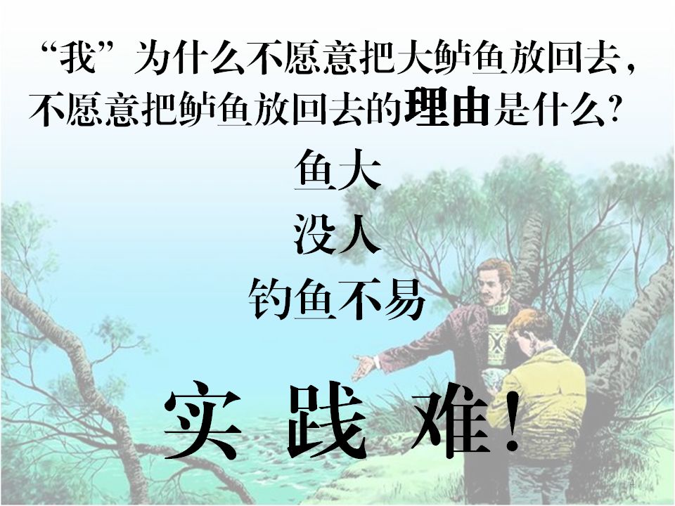 明白了作者不愿意把鱼放回去的理由,也就明白了作者为什么实践起来很难了吧,因为有这么多的理由。(PPT4 按动 实践难)