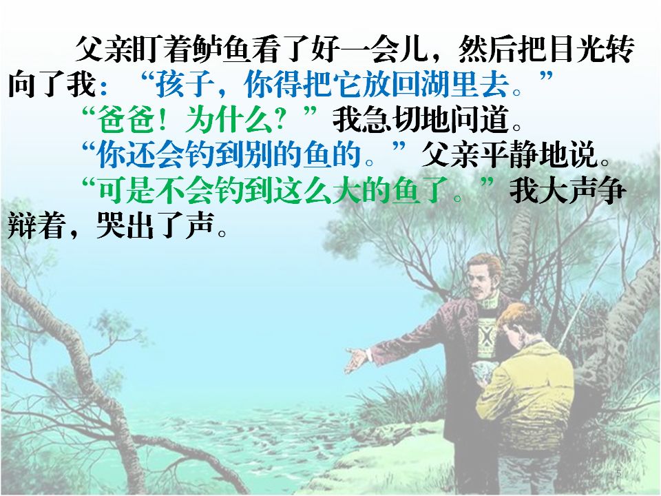 先观察一下课本上的插图,(PPT5 对话)孩子是怎样?很委屈的低着头抱着大鱼,父亲伸手指着哪里?湖,好像在说……把鱼放回去。朗诵的时候想象一下你就是父亲或者“我”,好好感受作者实践之难。同桌先相互练习一下。(空隙)