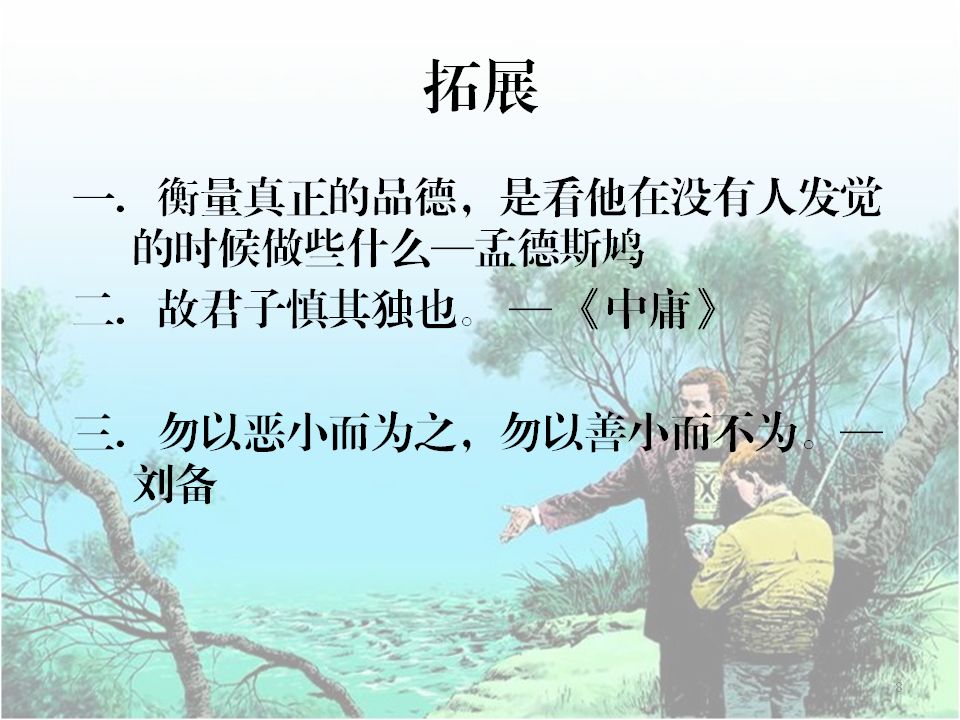 最后,老师想几句话送给大家。(PPT8)前两句其实讲的一个道理,只不过一个是西方哲学家,一个出自中国传统经典。举个现实生活中的小例子:老师布置让你默写,老师看不见,你是抄的还是写的?在超市买东西,当售货员阿姨多找了我零钱时,你是留着还是还回去?课后你们可以想想还有哪些小事。第三句使我们上学期学习的。就是告诉我们要从小事严格要求自己,不好的小也不做,因为做好了小事,当你面对人生种种诱惑的时候,才会有勇气和力量做出抉择!