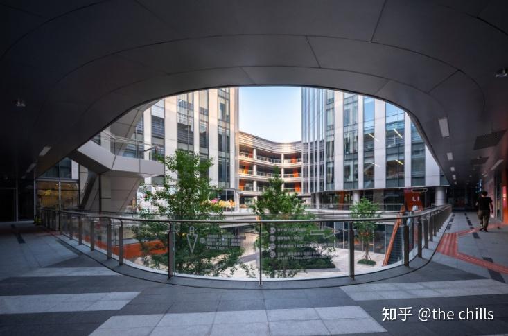 西北入口空间一放一收,好像一只眼睛、把世界都看在其中。阿里的标志性橙色,在绿树的映衬下显得格外活跃与夺目。醒目的自动扶梯与楼梯增加了空间的层次感。