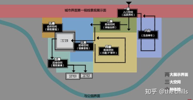 前场空间:一迎、二探(体验自然)、三赏(镜像景观)、四望(主题草坪)