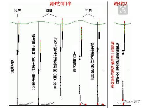 笔者这种调漂方法,只有两步,比起五步法要简单不少,只要有点调钓的经验就能轻松的掌握。而且这种方法,不需要反复精确找底,只要钓目大于漂目,那么就代表钩饵已经有地面支撑了,此时钩饵肯定已经到底了。假如漂尾露出水面不是很多,说明钩饵卧底不是很多,这种情况不会过于迟钝。