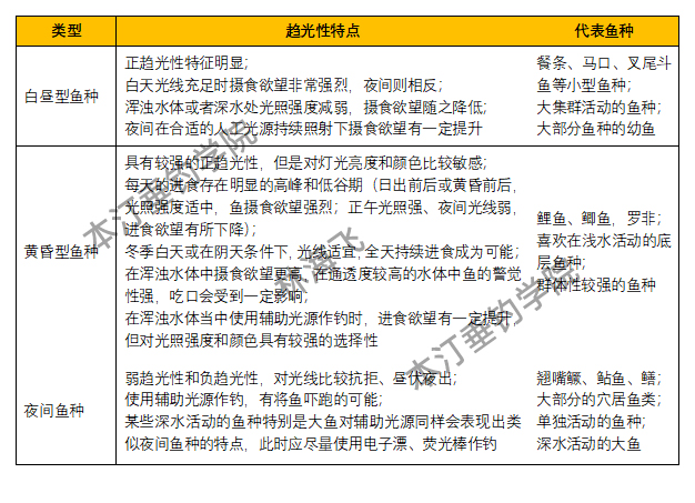 以上关于鱼类趋光类型的划分并不是一成不变的。同一个鱼种,在稚鱼期或者幼鱼期,一般都会表现出较强的正趋光性,反之,当进入成鱼阶段,鱼的正趋光性特征会有所减弱,甚至会表现出一定程度的负趋光性特征。在极度饥饿的条件下,出于生存的需要,某些弱趋光性甚至是负趋光性的鱼种,在人造光源的照射下也会表现出某些类似正趋光性鱼种那样的活动特征。在黑坑当中,甚至有可能形成以灯光为食物出现信号的条件反射(如黑坑鲫鱼大炮塘)。