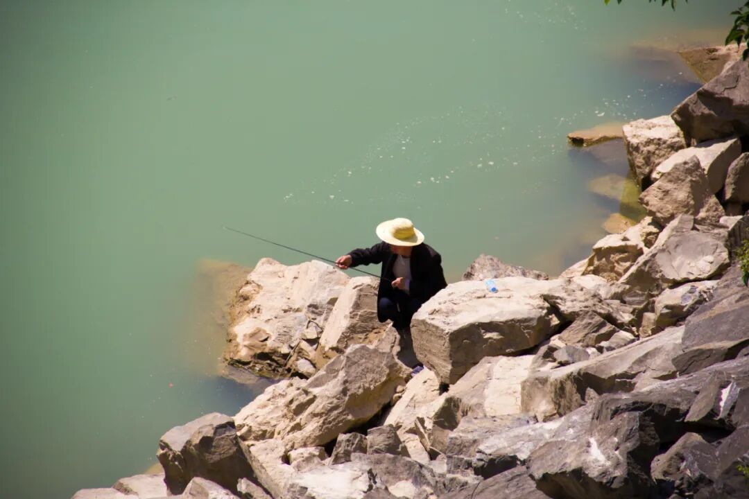再往前走,乱石堆中戴草帽的这位大叔,他选择的钓点更是一处津关险塞。