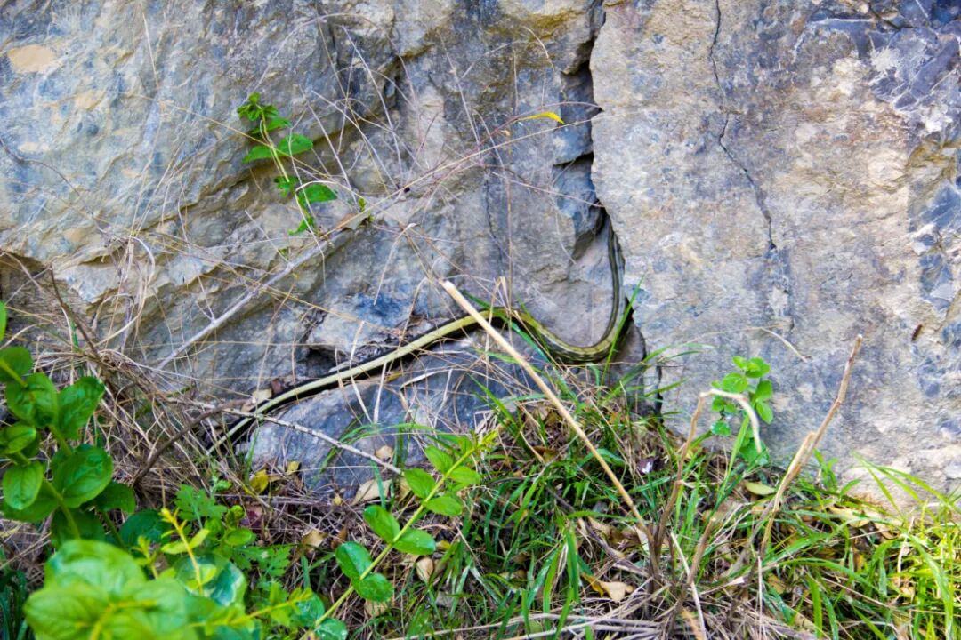 乡道与河岸中间,是下河的陡峭细路。不过,千万小心,细路上有蛇!