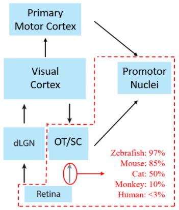 红色虚线部分是斑马鱼这类低等脊椎动物具有的脑区,虚线外的是人类等高级动物才具有的脑区,目前已知从视网膜到视顶盖或是视上丘的投射在鱼中为97%,鼠85%,猫50%,猴10%,人<3%,而顶盖和上丘所介导的运动相对简单,比如捕食,逃跑等,可以看出动物越高等,视觉信息流向顶盖/上丘的越少,流向视皮层的越多。可能是在进化过程中随着鱼进化为两栖再到爬行,陆地上的视觉环境信息以及地形越来越丰富,已有的生物大脑框架变得越来越落后,于是不得已只能在原有底层框架不变的情况下加入一个视觉信息输入的新框架,就有了视皮层,并且为了更好的适应各项任务不断的把皮层做深做大,为了更好的执行任务,就有了运动相关的皮层,最后发展到了今天人类这么大的皮层。像不像今天人工智能领域里,三层的全连接网络(类似鱼脑)能很好的解决手写数字集的分类,但遇到更复杂的分类任务时全连接网络就很落伍了,随后发展出了卷积神经网络的框架(CNN,类似皮层),并且在这基础上不断调参加各种新的隐含层进去以适应更难的任务(类似于皮层变厚的过程),最后有了人类这种复杂的生物。